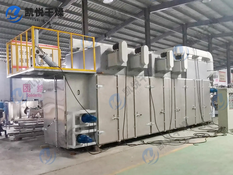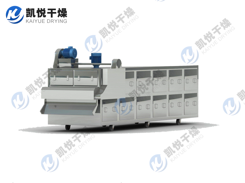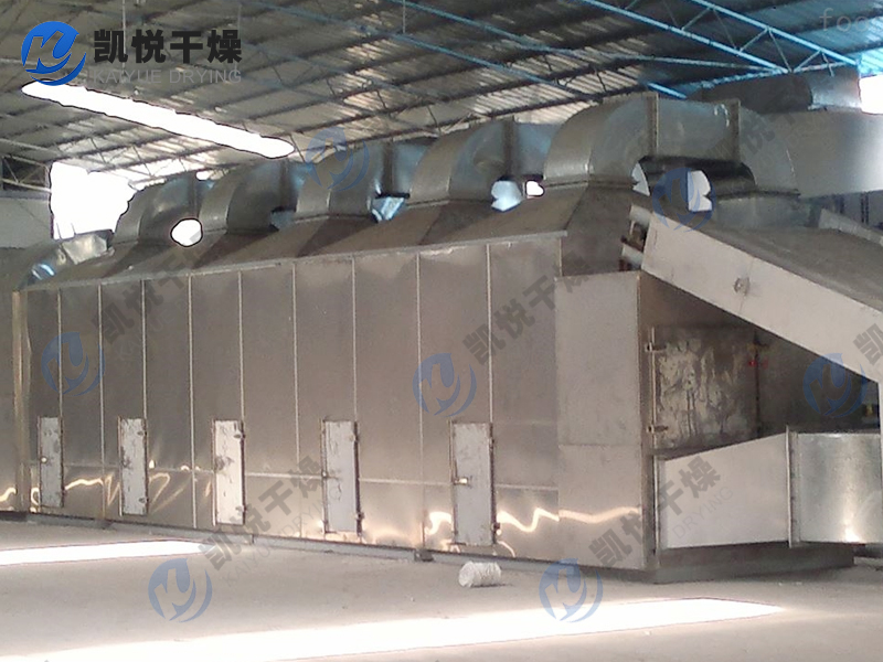 物料由加料器均勻地鋪在網(wǎng)帶上,網(wǎng)帶采用12-60目不銹鋼絲網(wǎng)。由傳動裝置拖動在干燥機內(nèi)移動。干燥機由若干單元組成,每一單元熱風(fēng)獨立循環(huán),部分尾氣由專門排濕風(fēng)機排出,廢氣由調(diào)節(jié)閥控制,熱氣由下往上或由上往下穿過鋪在網(wǎng)帶上的物料,加熱干燥并帶走水分。網(wǎng)帶緩慢移動,運行速度可根據(jù)物料溫度自由調(diào)節(jié),干燥后的成品連續(xù)落入收料器中。上下循環(huán)單元根據(jù)用戶需要可靈活配備,單元數(shù)量可根據(jù)需要選取。