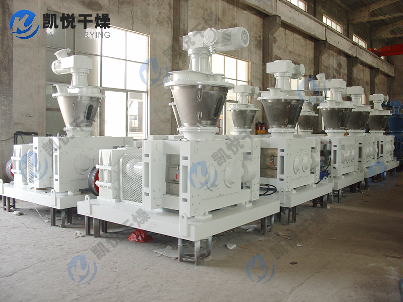 粉狀物料由振動(dòng)給料斗經(jīng)橫向螺旋送料器定量,均勻地加人軋片主料斗,使軋片主料斗內(nèi)保持恒定的料粒,然后由軋片主料內(nèi)的縱向錐螺旋對(duì)粉料進(jìn)行預(yù)壓縮并輸送到兩只壓輥的弧形槽口,兩只壓輥表面均勻分布形狀相同的半扁圓形弧槽或菱形槽,通過(guò)一對(duì)齒輪的嚙合傳動(dòng),使兩只壓輥等速,反向旋轉(zhuǎn),將錐螺旋輸送至槽口的物料咬入槽內(nèi)并瞬間強(qiáng)制壓縮,物料經(jīng)過(guò)壓縮后隨著壓力逐漸減小在其彈力及重力作用下,從槽內(nèi)脫落,進(jìn)入破碎整粒系統(tǒng),然后根據(jù)用戶的粒度要求過(guò)篩、分級(jí),得到符合質(zhì)量要求的均勻顆粒狀產(chǎn)品,篩下粉重新返回振動(dòng)料斗循環(huán)利用。