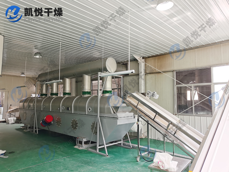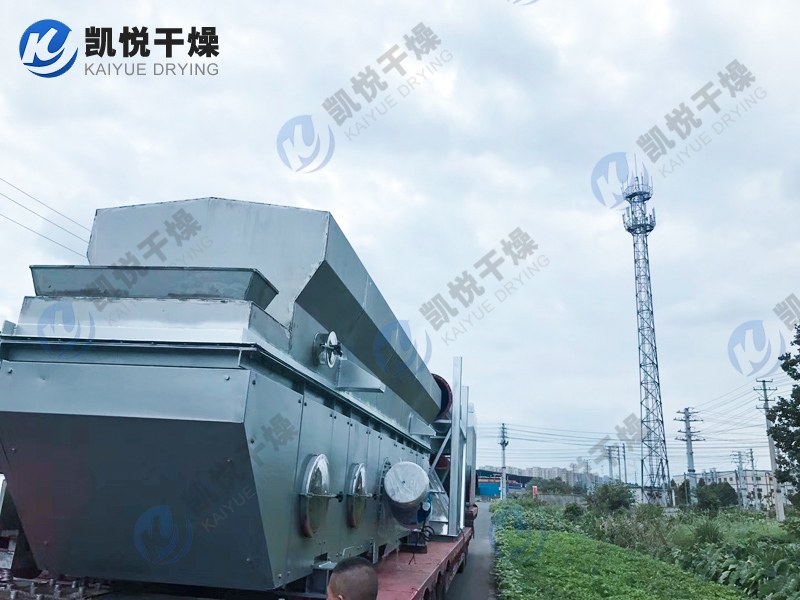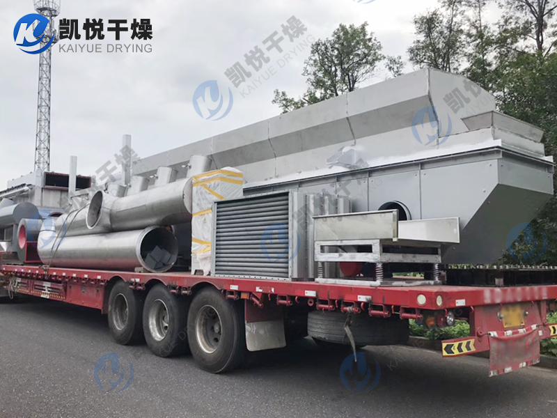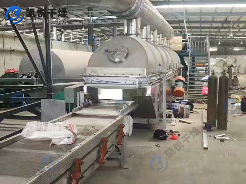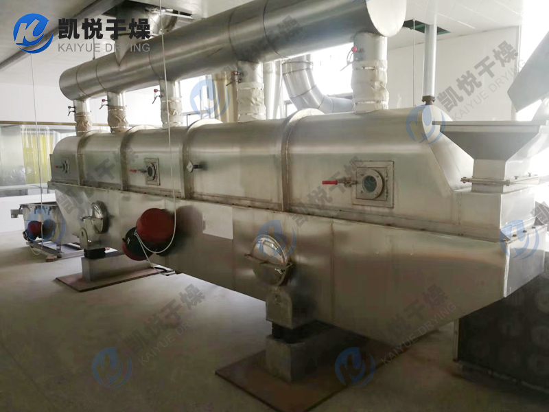 物料自進(jìn)料進(jìn)口進(jìn)入機(jī)內(nèi),在振動(dòng)力作用下,物料沿水平面流化床拋擲,向前連續(xù)運(yùn)動(dòng),熱風(fēng)向上穿過流化床同濕物料換熱后,濕空氣經(jīng)旋風(fēng)分離器除塵后由排風(fēng)1:3排出.干燥物料由排料進(jìn)口排出。