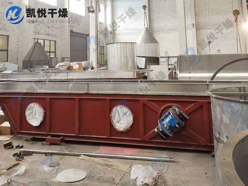 物料自進料進口進入機內(nèi),在振動力作用下,物料沿水平面流化床拋擲,向前連續(xù)運動,熱風(fēng)向上穿過流化床同濕物料換熱后,濕空氣經(jīng)旋風(fēng)分離器除塵后由排風(fēng)1:3排出.干燥物料由排料進口排出。