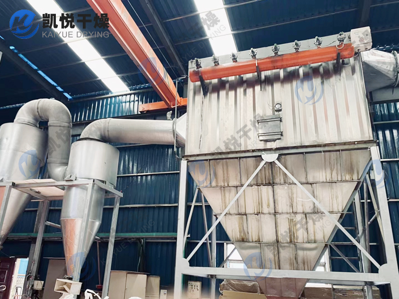 粒度分級:在干燥主機(jī)的上部設(shè)置環(huán)形擋板,此被稱為閃蒸干燥機(jī)分級器。當(dāng)物料運(yùn)動經(jīng)過該分級器時變會受到離心力的作用,呈現(xiàn)不同旋轉(zhuǎn)半徑螺旋上升的趨勢。粒徑較小的物料從分級器的內(nèi)孔排出;顆粒較大的物料被留在干燥室內(nèi)繼續(xù)粉碎,待達(dá)到標(biāo)準(zhǔn)粒度從內(nèi)孔排出。