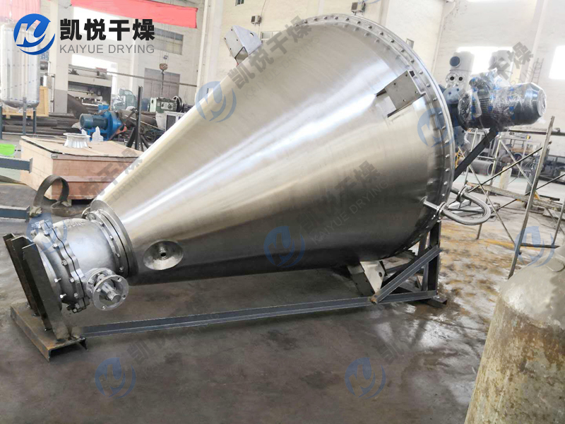 1、單錐真空干燥機(jī)工作過程為間歇批操作,濕物料進(jìn)入料倉后,通過筒壁夾套和螺旋槳內(nèi)部給熱,使給熱面積達(dá)到整個容器面積的140%,對物料進(jìn)行升溫干燥。并選擇相應(yīng)的錐型干燥混合器型號(工作容積)達(dá)到理想的干燥效果。采用上驅(qū)式結(jié)構(gòu)的混合干燥機(jī)具有高效干燥、混合能力的同時,具有空間充裕,更便于使用者進(jìn)行檢修維護(hù)的特點。